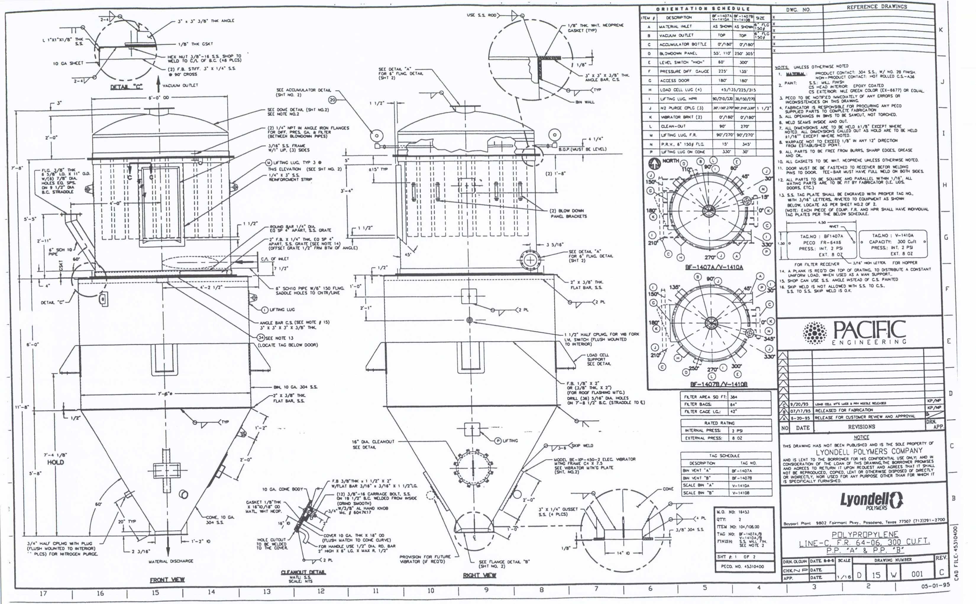 TYPE:Bag housing with vertically supported fabric bags which retain dust particles as low pressure dust-ladened air flows through them. Process air enters lower plenum, and exits after passing through the bags out of the top discharge manifold. Bags are perio