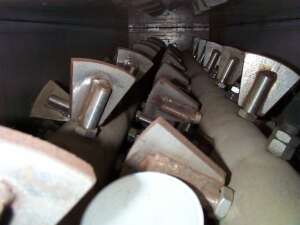 TYPE:Pugmill. Horizontal trough with rotating heavy duty dual shafts with bolted, replaceable, short paddle type blades or fingers. Heavy duty mastication, delumping action. Typically used in clays, limestone, cement plants.
