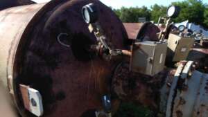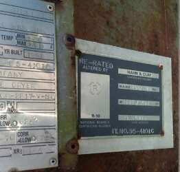 - COMMENTS-ASME ETC.:Top demister tower, 18" x 24" approx. Internal liquid sparger. External 3.5" R.G. insulation w/corrugated aluminum sheath external. Vessel CS only est.wt.16000#, Total empty wt. Per nameplate 61678# [w/insulation]